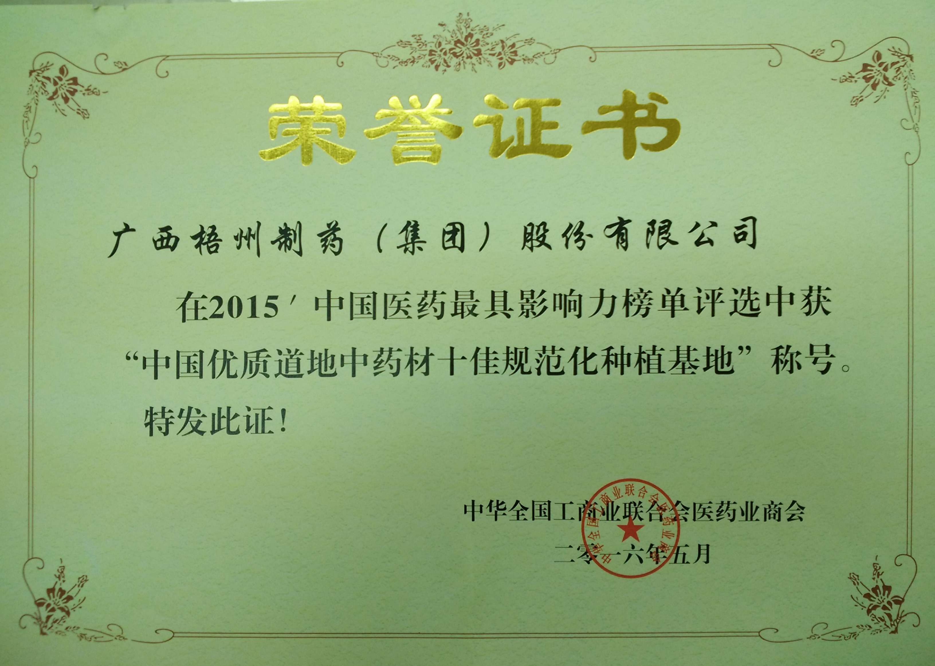 榮獲2015年度中國優(yōu)質道地中藥材十佳規(guī)范化種植基地稱號