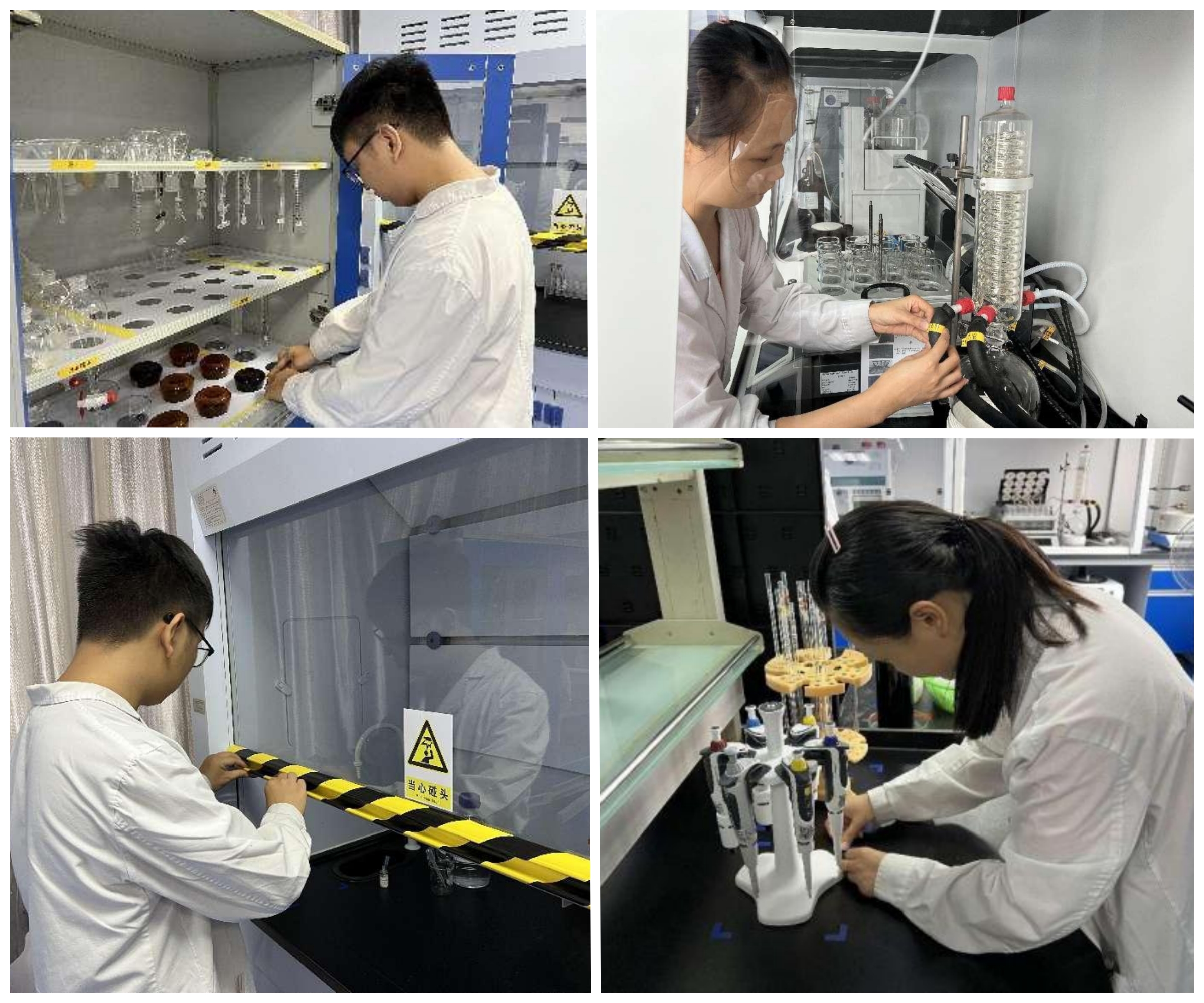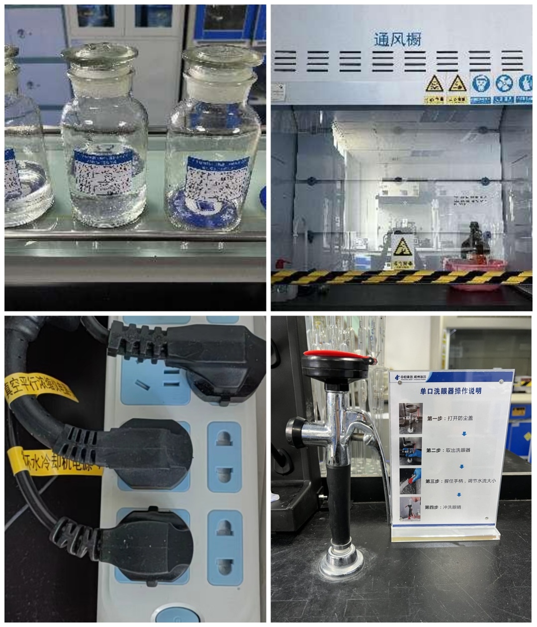 安全是企業(yè)的生命。實(shí)驗(yàn)室內(nèi)存放的試劑、各種檢驗(yàn)操作均存在一定的風(fēng)險(xiǎn),做好安全警示,既是保證安全檢驗(yàn),也是人員健康的一大保障。將試劑按酸(紅)、堿(黃)、普通(藍(lán))、有毒(黑)分類標(biāo)識(shí),標(biāo)識(shí)后試劑屬性及風(fēng)險(xiǎn)清晰明了。在通風(fēng)櫥增加黃黑警示線及安全警示標(biāo)示等,提醒人員做好安全防護(hù)。梳理管道、電源線走向與標(biāo)識(shí),在緊急狀態(tài)下能快且準(zhǔn)地拔插頭斷電。應(yīng)急處理的洗眼器旁放置操作方法標(biāo)示,便于緊急狀況下的準(zhǔn)確操作。這一系列舉措極大提高了檢驗(yàn)工作的安全性。