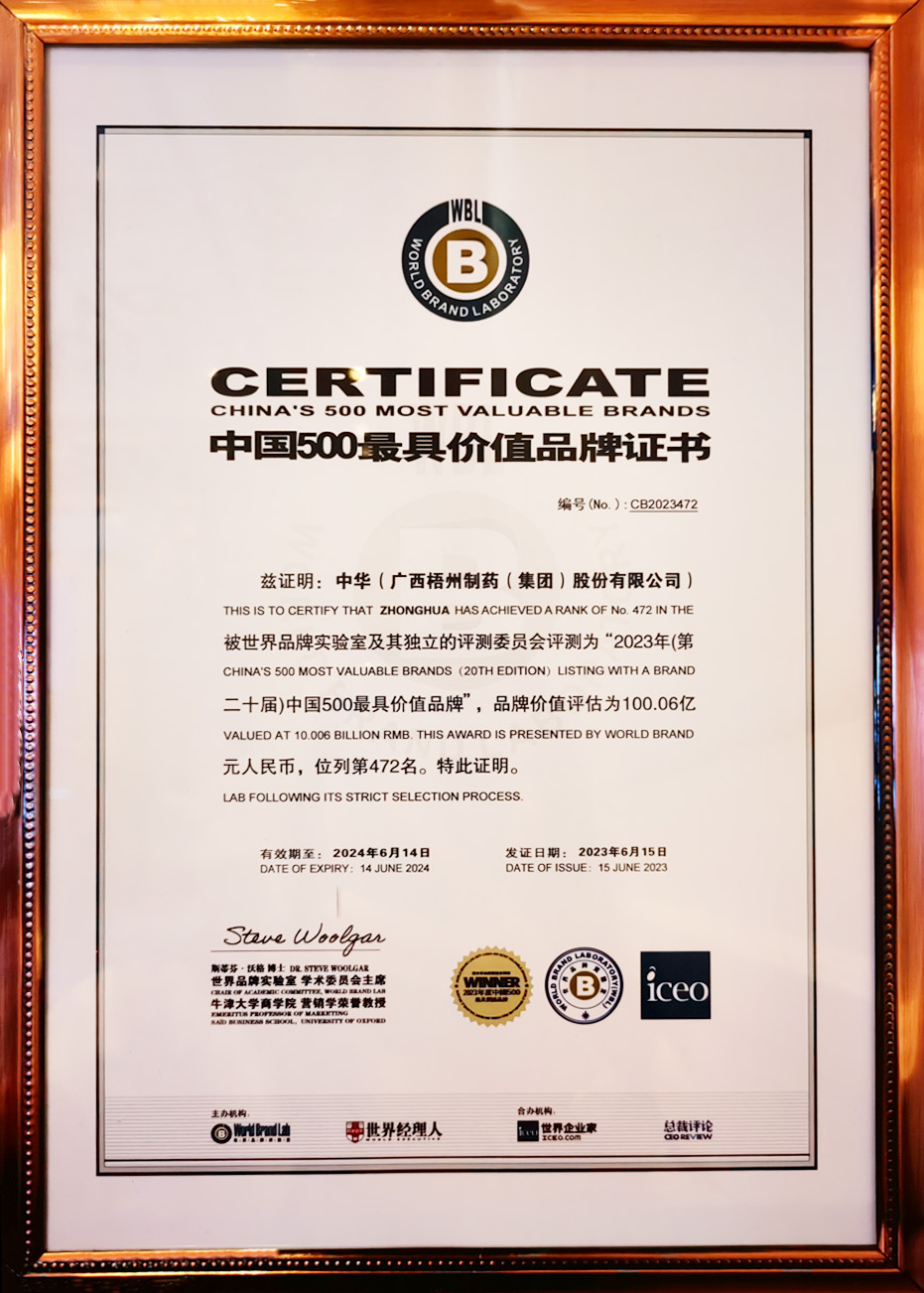 早在2021年,中國品牌建設(shè)促進會已將“中華”品牌列入“中華老字號”組50強,品牌價值為70.52億元。2023年,“中華”品牌經(jīng)世界品牌實驗室及其獨立的評測委員會評測認(rèn)證,成功入選2023年(第二十屆)中國500最具價值品牌,獲此殊榮,是世界品牌實驗室對梧州制藥持續(xù)推進“中華”品牌建設(shè),實現(xiàn)品牌價值不斷提升的充分肯定。同時,彰顯了公司穩(wěn)健的發(fā)展態(tài)勢和強勁的品牌實力。