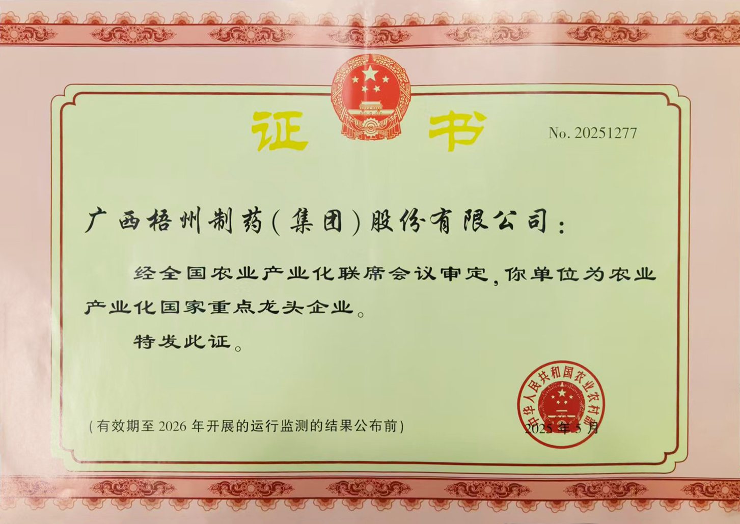 廣西梧州制藥(集團(tuán))股份有限公司獲評農(nóng)業(yè)產(chǎn)業(yè)化國家重點龍頭企業(yè)