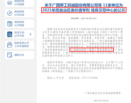 近期,廣西壯族自治區(qū)市場監(jiān)督管理局發(fā)布關(guān)于2021年度自治區(qū)高價(jià)值專利培育示范中心的公示名單,梧州制藥被確定為2021年度自治區(qū)高價(jià)值專利培育示范中心。建設(shè)高價(jià)值專利培育示范中心,
